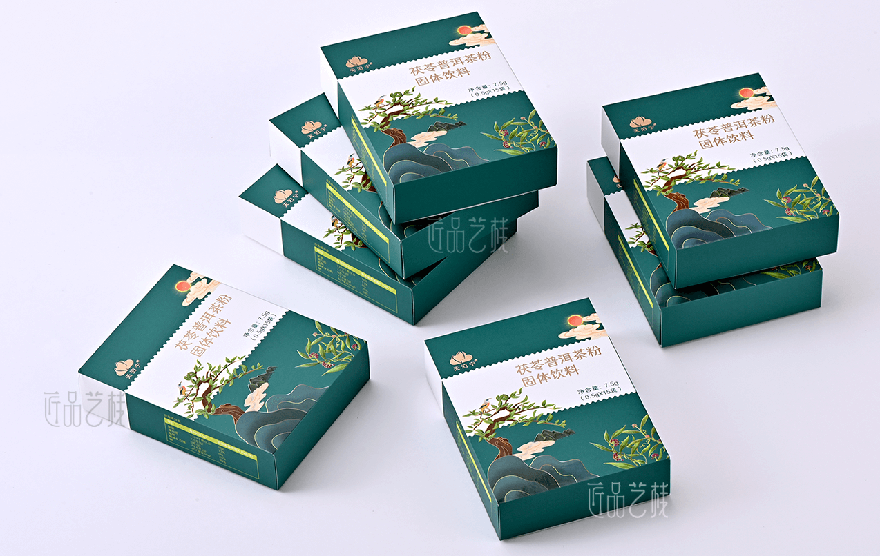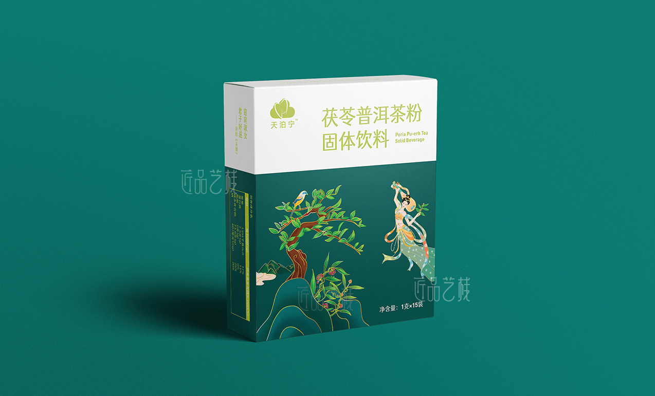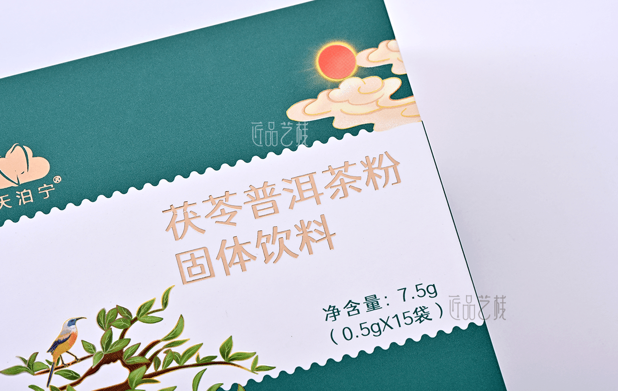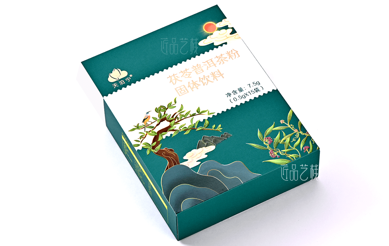 天泊寧普洱茶粉固體飲料,經(jīng)現(xiàn)代生物技術(shù)加工,科學保留普洱茶和獲苓的有益成分科學配比,是一款真正原生態(tài)、時尚快捷、創(chuàng)新型健康固態(tài)飲品。在該品牌包裝盒設計中,我們采用原創(chuàng)插畫方式設計,搭配進口特種紙卡紙,及精制的表面和成型工藝;打造又一款從設計到印刷整體方案解決優(yōu)秀包裝盒定制案例。