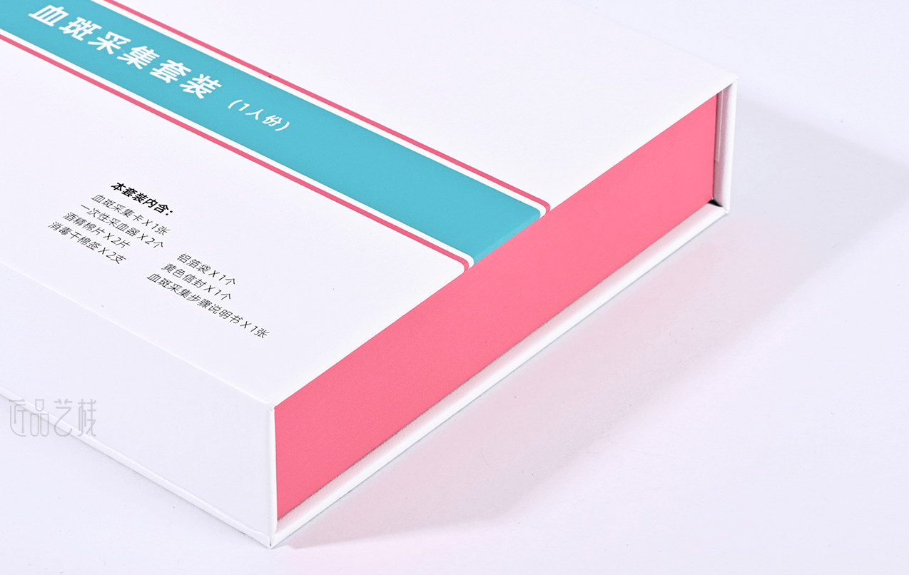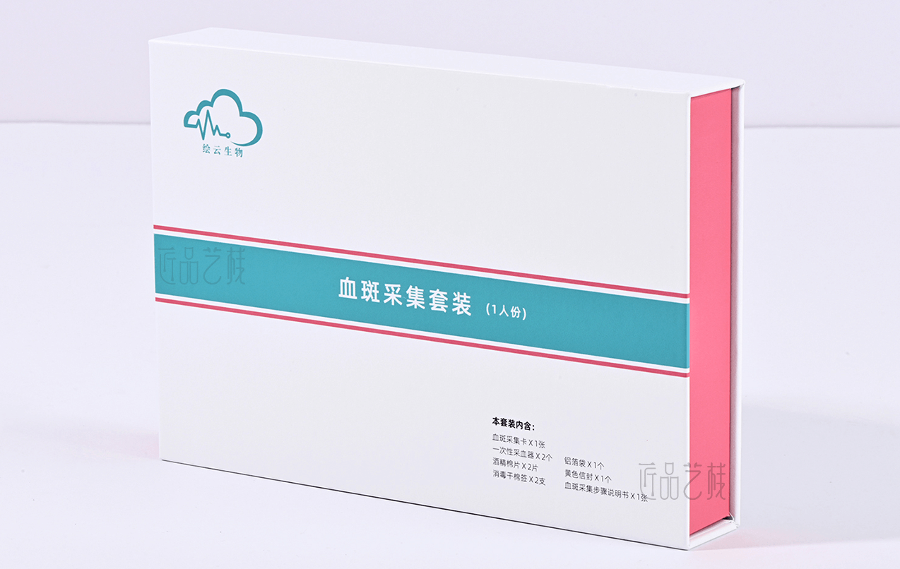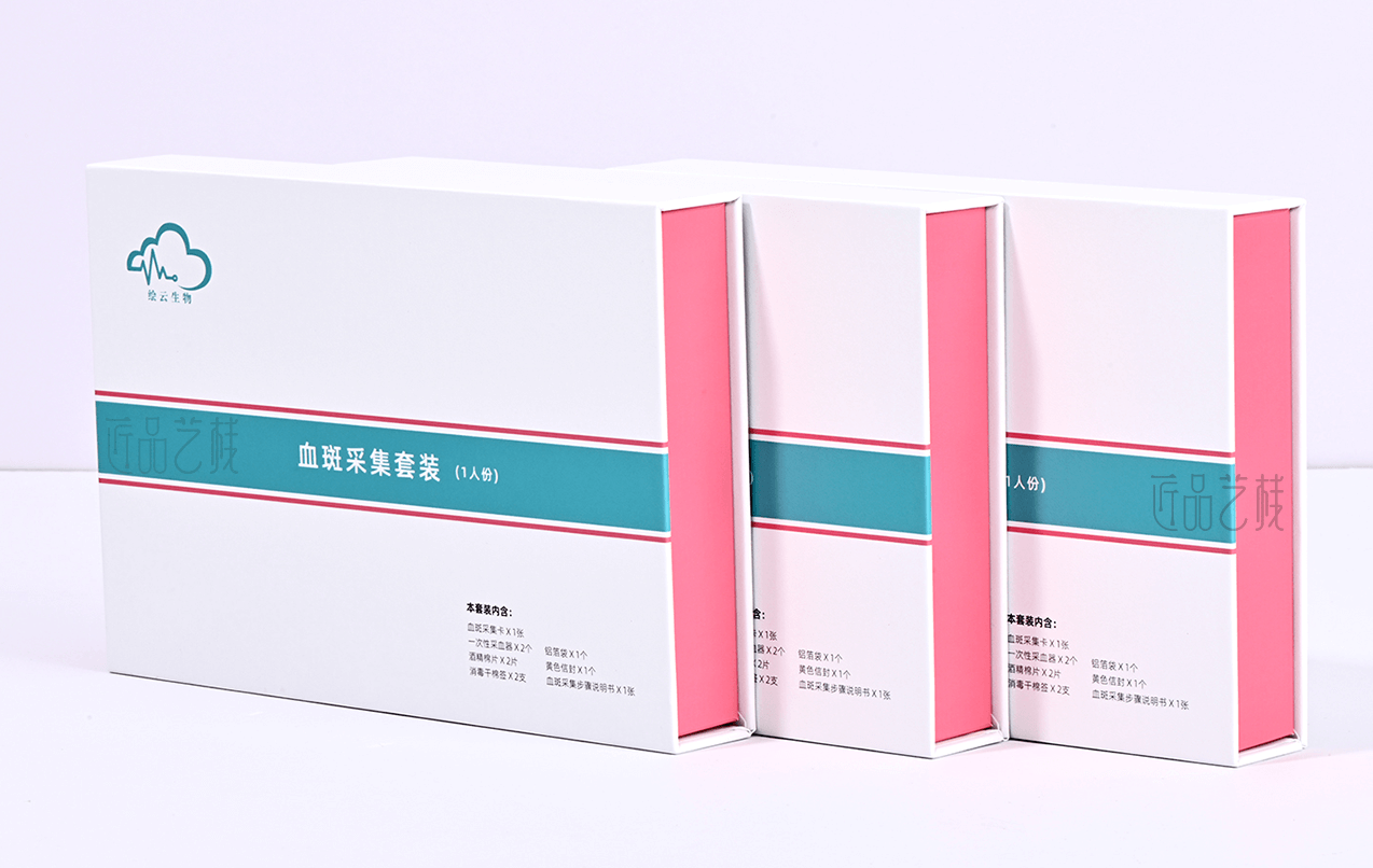 繪云生物科技,國家高新技術(shù)企業(yè),自有一系列自主知識產(chǎn)權(quán)的體外診斷試劑盒、智能輔助軟件和健康飲品和多項科研和醫(yī)學(xué)檢驗服務(wù)。針對該血斑采集試劑盒定位為高端檢測人群和渠道,佳潤隆包裝&匠品藝棧在設(shè)計印刷中,采用硬卡精裝結(jié)構(gòu)模式,運用科技藍和血斑粉紅為主色搭配,以簡約的風(fēng)格和精致的材質(zhì)、工藝,打造與繪云生物科技合作中又一優(yōu)秀包裝設(shè)計印刷案例。