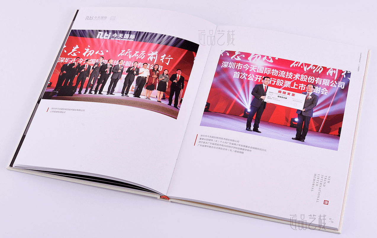 深圳今天國際物流技術(shù)公司,于2000年在深圳成立,股票代碼:300532。在今天國際上市之際,我們采用以上市流程敘述的手法,以現(xiàn)代簡約、國際范和喜慶的風(fēng)格,結(jié)合進(jìn)口紙張和精裝工藝,使整本紀(jì)念冊(cè)體現(xiàn)喜慶并不失奢華,讓人感受今天國際企業(yè)實(shí)力的同時(shí),加以珍惜收藏。