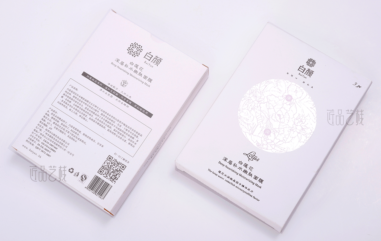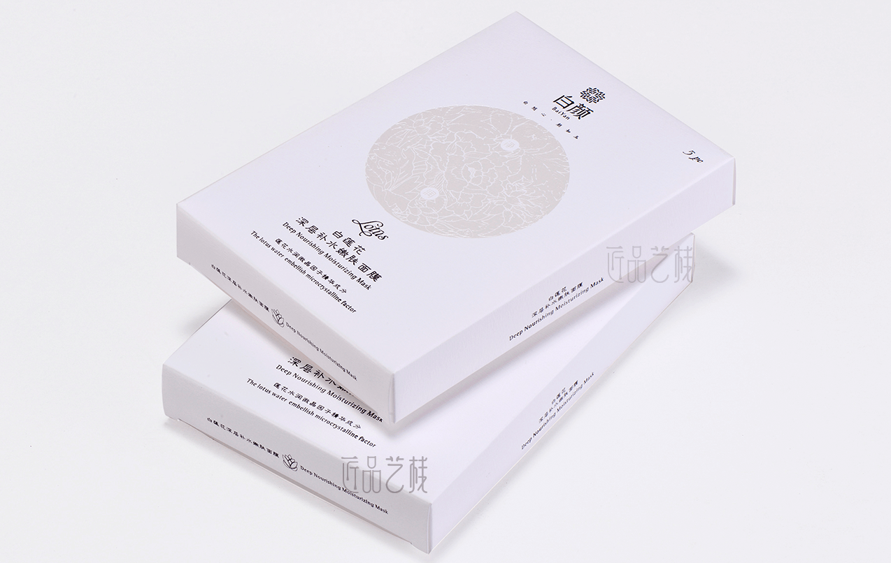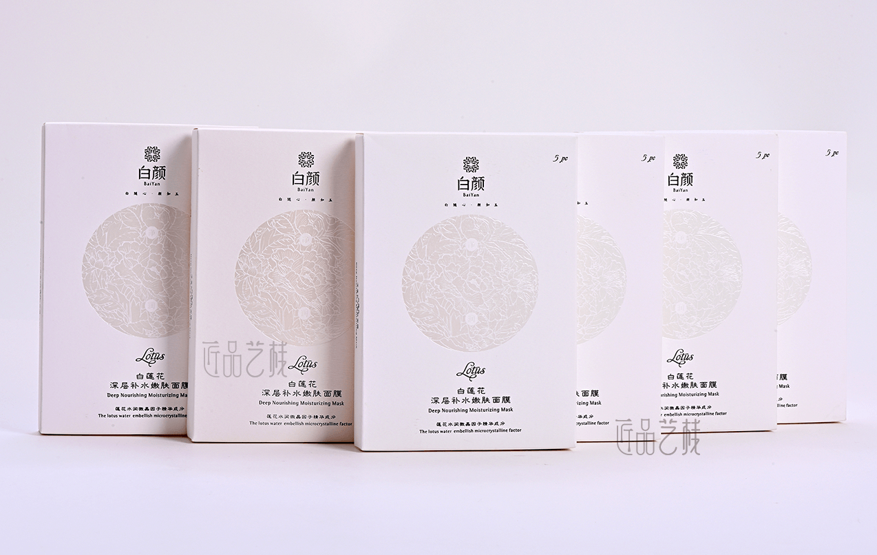 深圳白顏化妝品有限公司,旗下自主經(jīng)營白顏品牌系列白蓮花深層補(bǔ)水嫩膚面膜,在其產(chǎn)品包裝盒定制合作中,佳潤隆包裝印刷&匠品藝棧采用特種白卡紙張,海德堡彩色機(jī)印刷,白色與黑色金燙印,并配置a級(jí)瓦楞紙內(nèi)托,使該面膜包裝盒呈現(xiàn)出簡(jiǎn)而不凡的品牌氣質(zhì)。